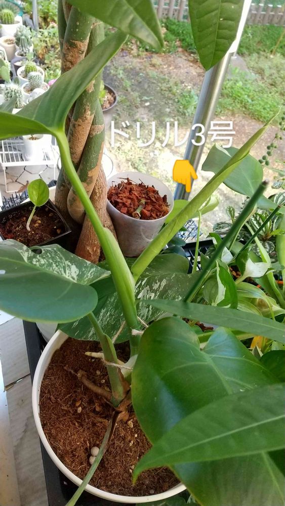 斑入りモンステラのドリル3号発見🧐昨日は真っ直ぐだったのに今朝は斜めに傾いてた