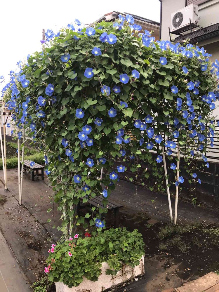 西洋朝顔、カレドニアブルーがますます咲いてきました。一本の苗からこんなに咲くとは思いませんでした。てっぺんにもさいているのですが下からは見えません。一度上からも見てみたいものです。