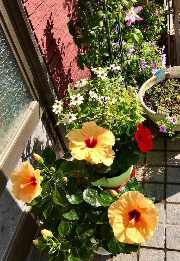手前のハイビスカスさんは2〜3日咲くハイビスカス.ロングライフ・アドニスアプリコットは4輪咲いています🥰👍