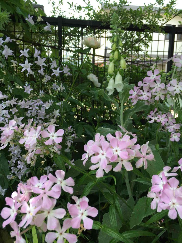 我が家の宿根草たち。フロックスピロサは、丈夫で香りもあります。奥はカンパニュラ涼姫と白のジキタリスなど。