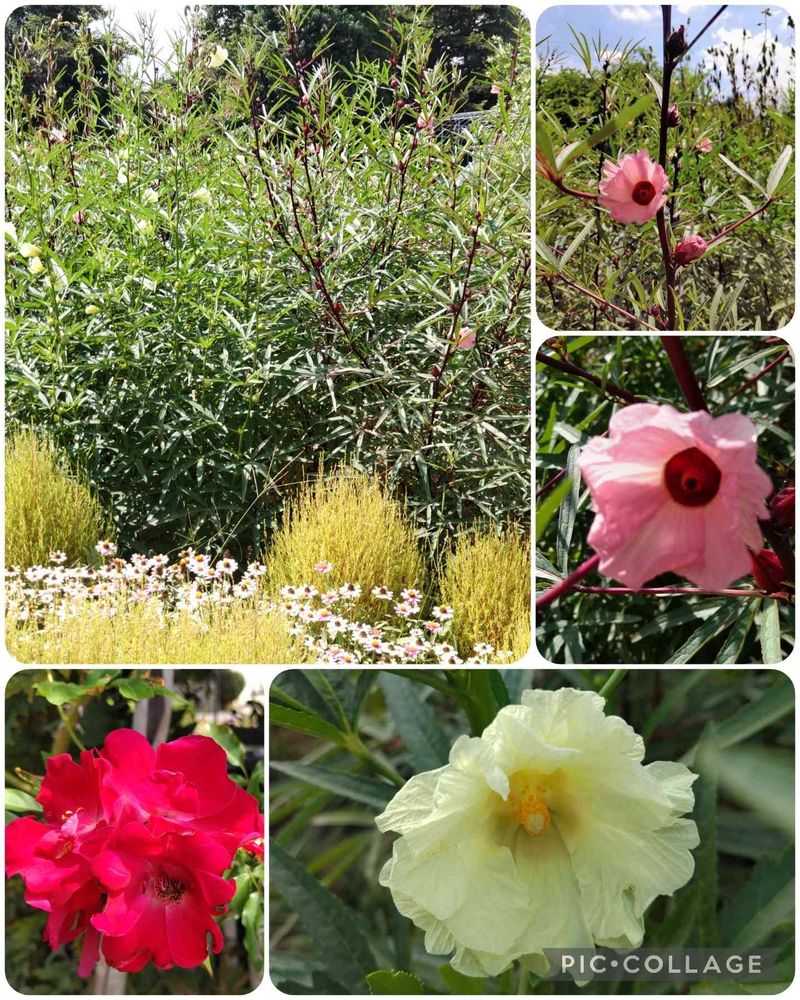ロ―ゼルが、沢山咲きだしました♥。側の藤棚の周りに咲いてる🌹ドルトムントも、仲間入りしてます。秋晴れです。