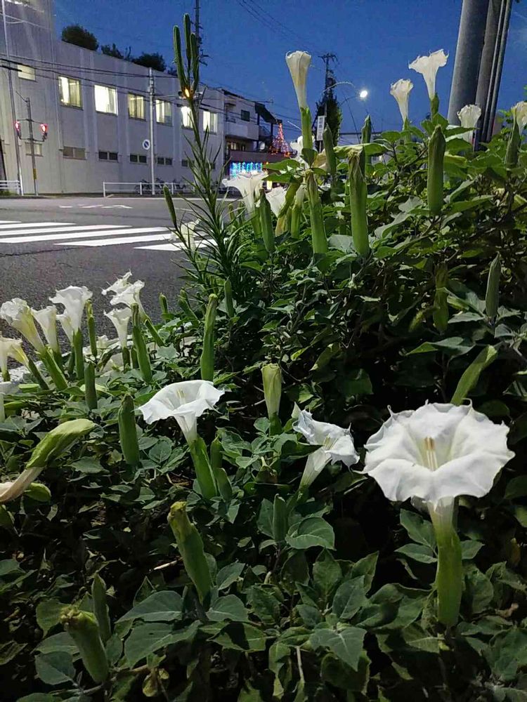 私の散歩コースにもシマトネリコの木🌳の下に、ケチョウセンアサガオ植えられてます。でも、こんなに沢山の花は初めて😍
