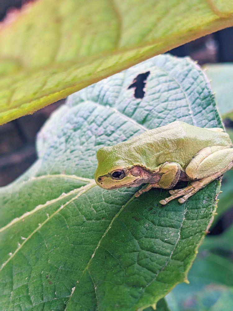 昨日のカエルさんかしら、色を変えて戻ってきたみたい😊今度はカシワバアジサイにポジションちぇんじ‼️🐸🐸🐸🐸🐸