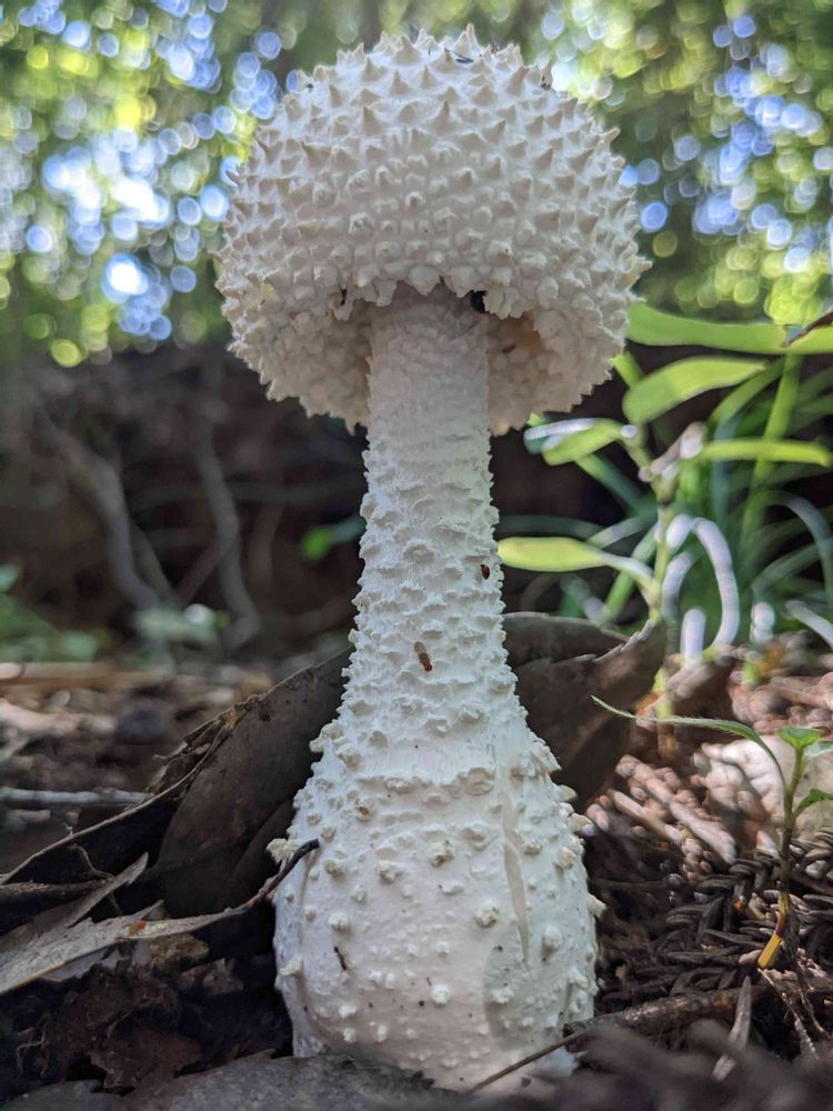 杉や竹、雑木に囲まれた切通しのような薄暗い林縁に~トゲトゲ‥イボイボ‥の白いキノコが1本立っていました~😲