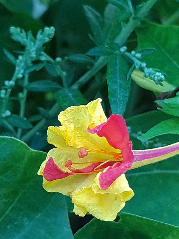 開花半ばの白粉花、気を付けて見たことなかったのでわたしにとって新鮮でした。