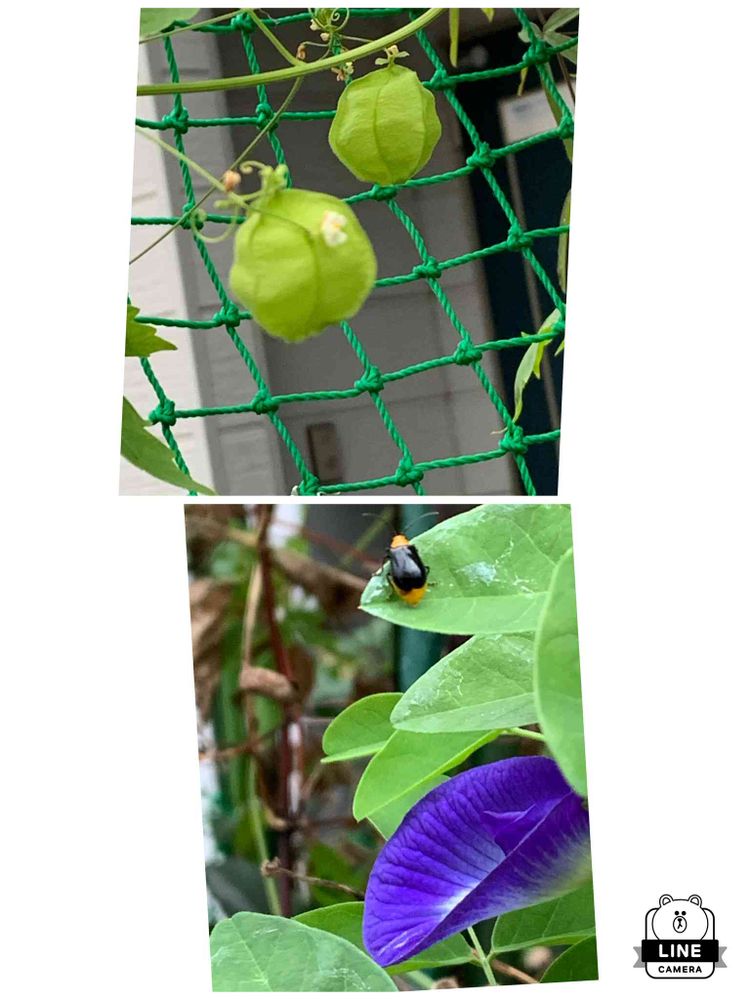 風船カズラの風船ができてきてると水やりの時に見てたら、バタフライピーにツルツルの黒いむしがついててびっくり‼️