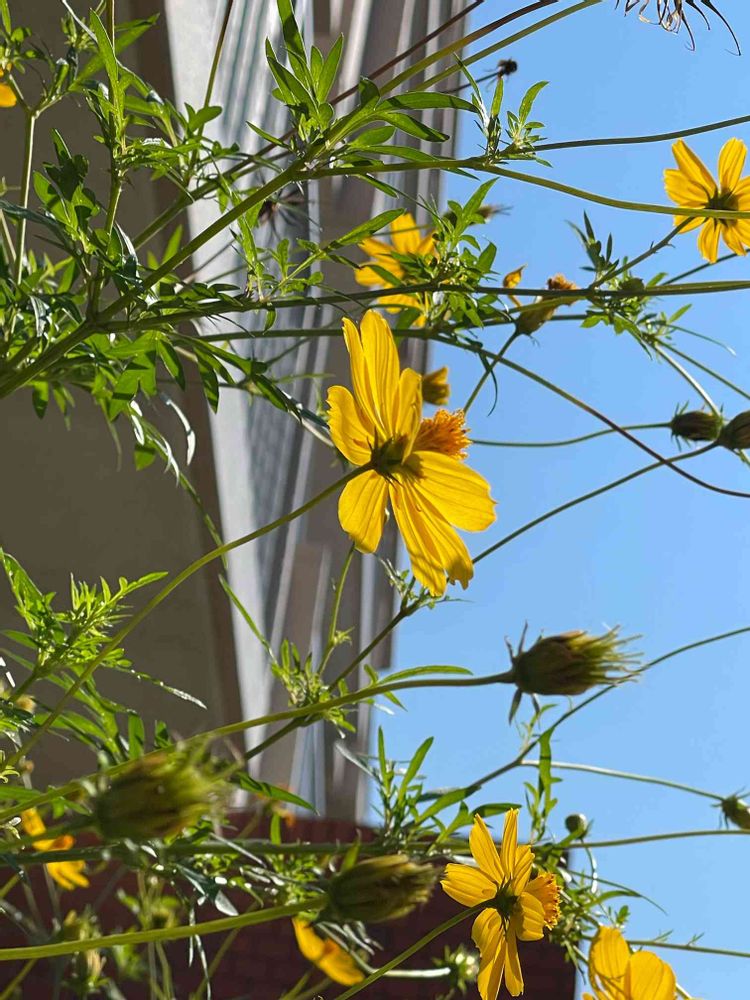 普通のコスモスは夏の暑さに草臥れていますが 黄花は強いです🌼🌼🌼