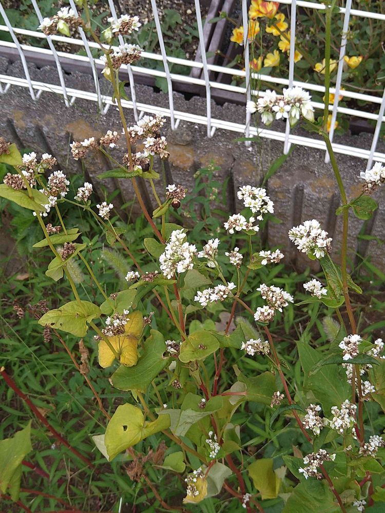 歩道脇の花壇に蕎麦の花が咲いていました。