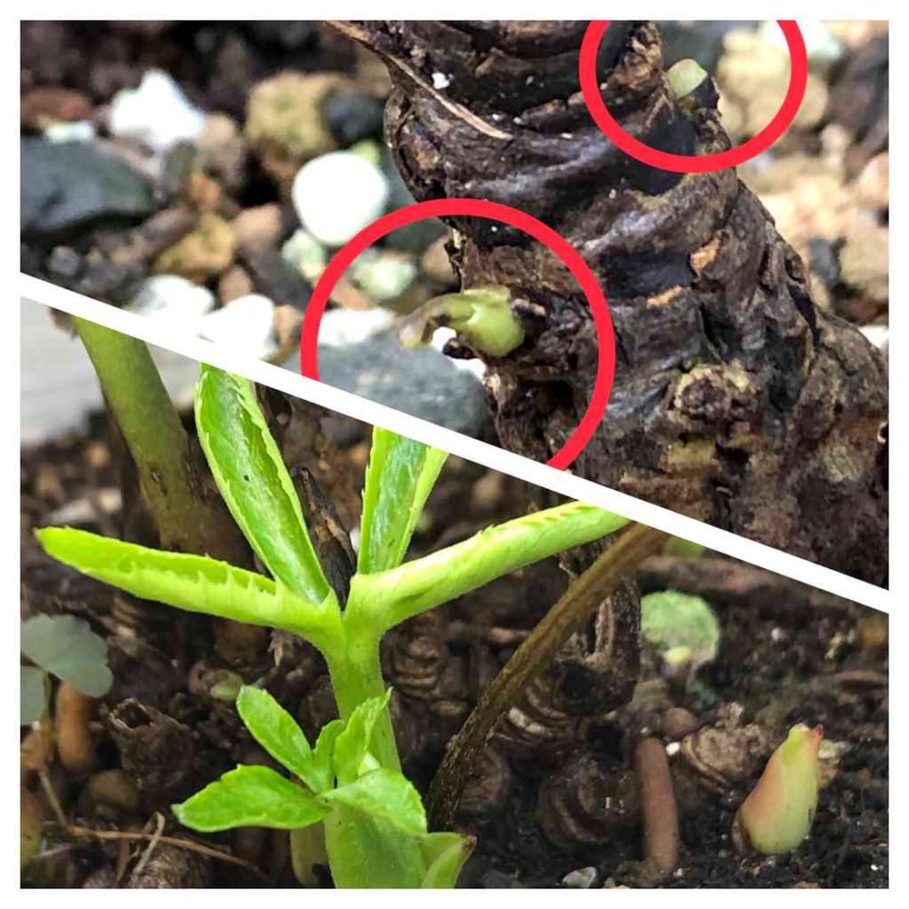 【上】枯れた棒1本になって、もうダメだと思ってたクリスマスローズのシルバーダラーに新芽を見つけた😭✨️