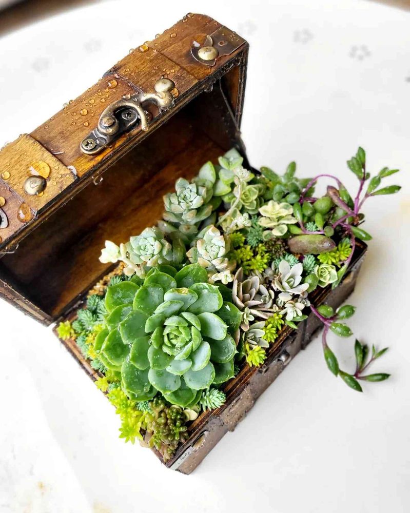今朝は涼しかったので、この前見つけた宝箱のプランターに寄せ植えしてみました^^