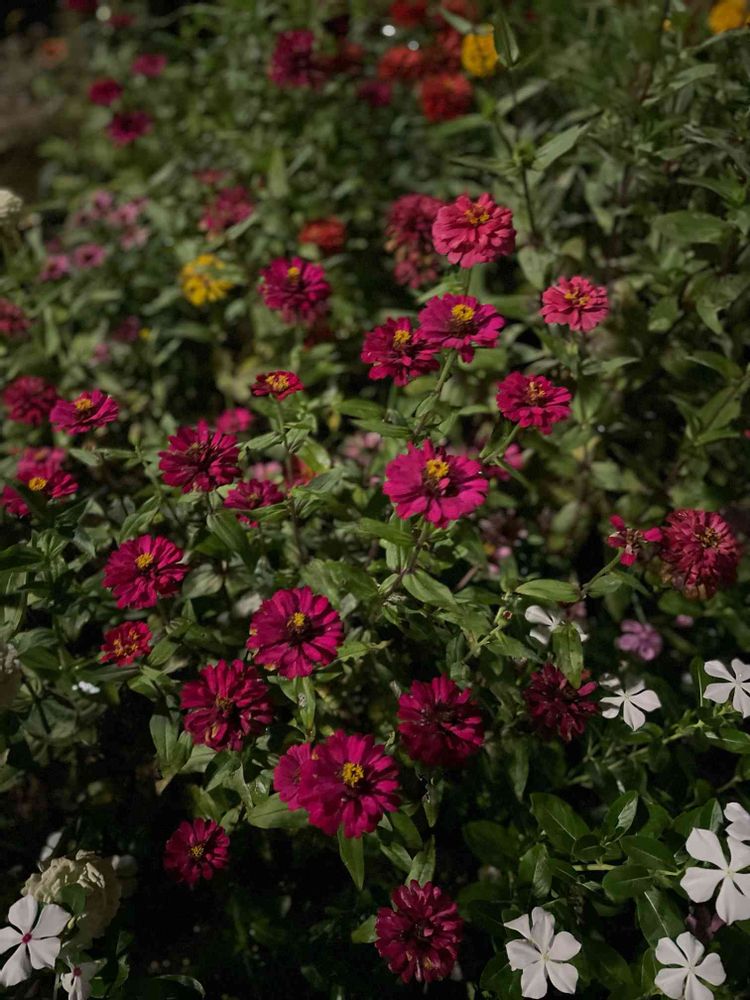 日没後の赤いジニアと白いニチニチソウ