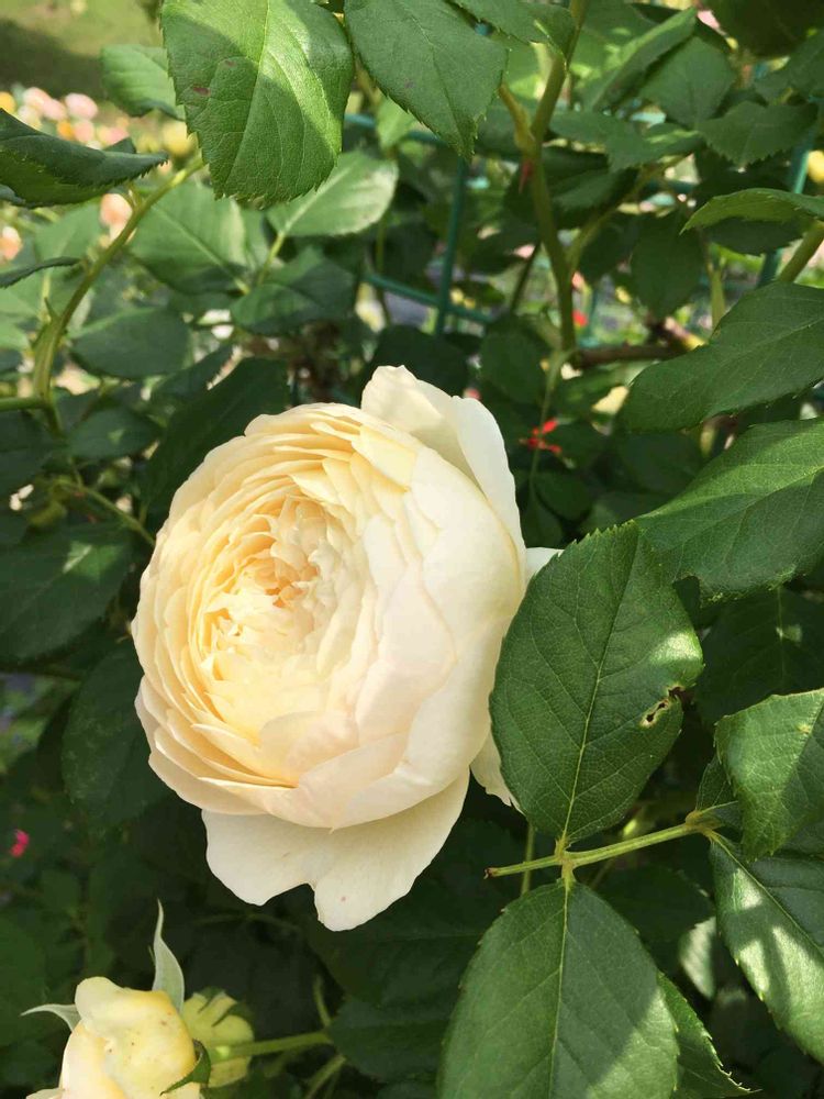 バラ、クレアオースチン。結局、芽吹き時のゾウムシ被害で、この二輪のみ。米ぬか+善玉菌とニーム、それから指と目で育ててるので、繊細な子は厳しいです。