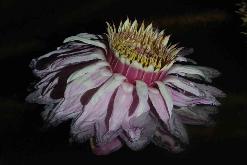 やっと生まれて初めてオニバスの開花を見られてめちゃ嬉しかった🥰撮影時間は夜8時40分です。白い花はライトを当ててダメってこの花は当てました❢うむむ....。なぜかダメかわからないので難しい💦