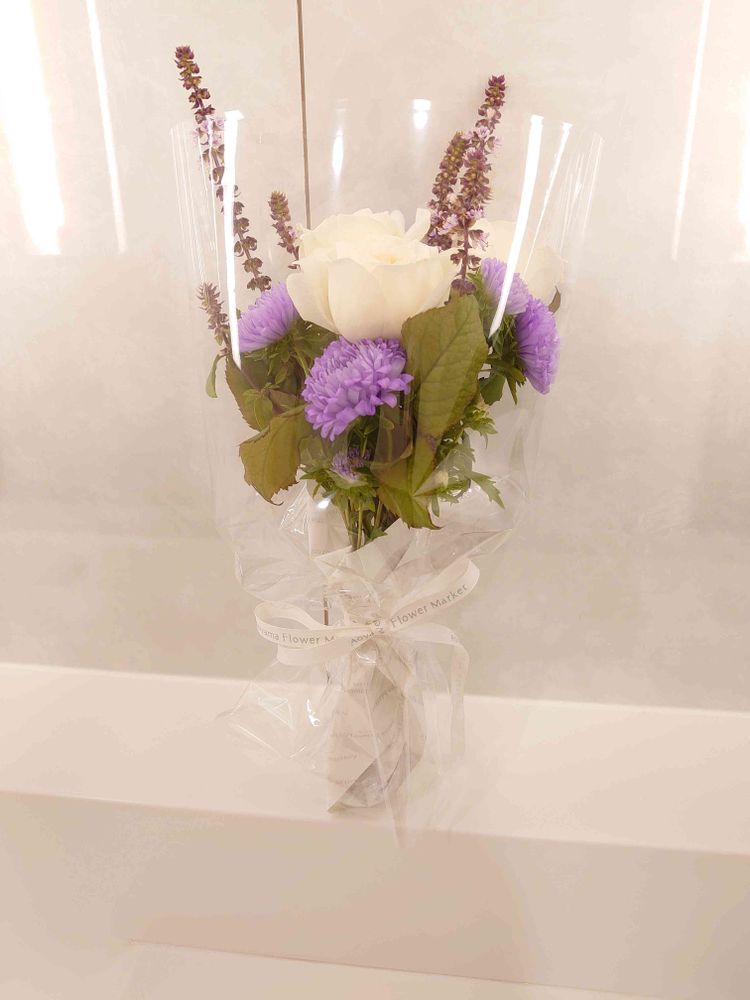 やはり白い薔薇かなと。白にグリーンを少し入れてもらうだけにしようとしましたが、やはり少しさみしいので、紫も入れてもらいました。