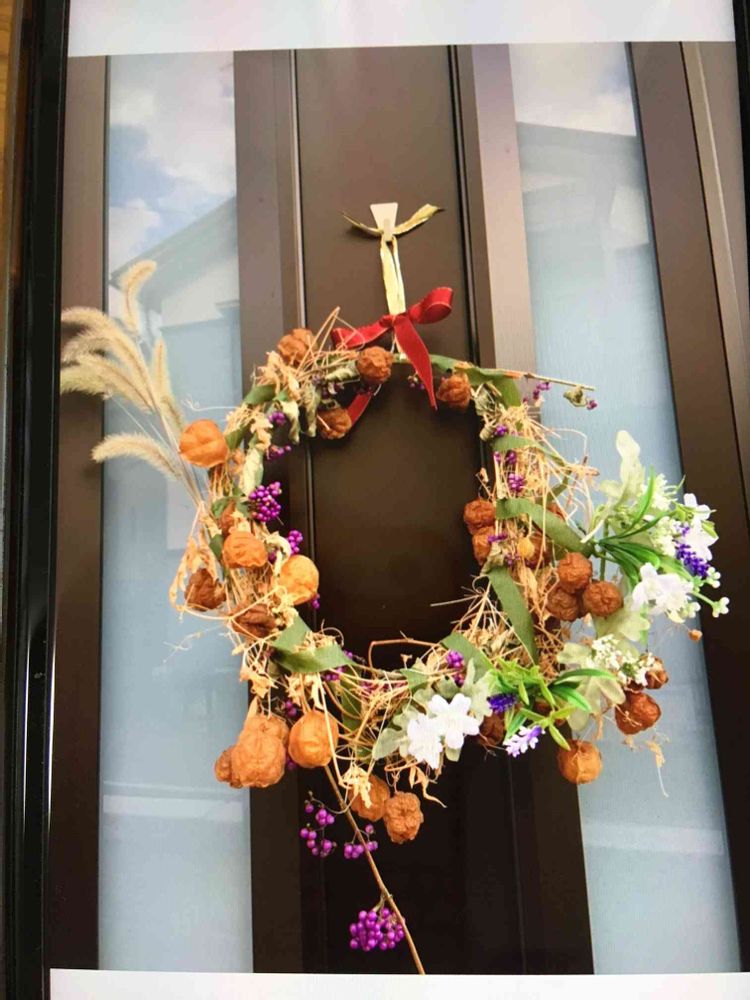 ご近所さんに作っていただいた風船かずらリースに猫ジャラシと小紫式部を付けました