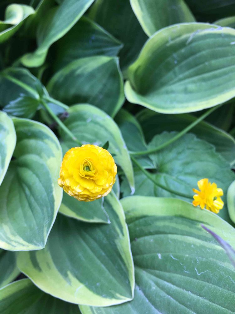 背景の葉は擬宝珠。黄色い花の名前を教えて下さい。