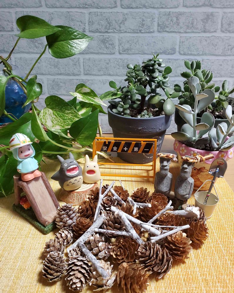 『さ~今日はモアイ🗿さんとトトロの日だから皆で目の前の松ぼっくりかたづけちゃうよ💪』