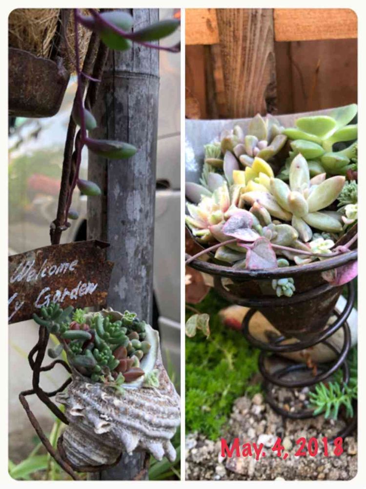 この前、お友達のるるちゃん貰ったのおたま風サザエ鉢とスプリング鉢にやっと寄せ植えできた〜٩(ˊᗜˋ*)و✧*。