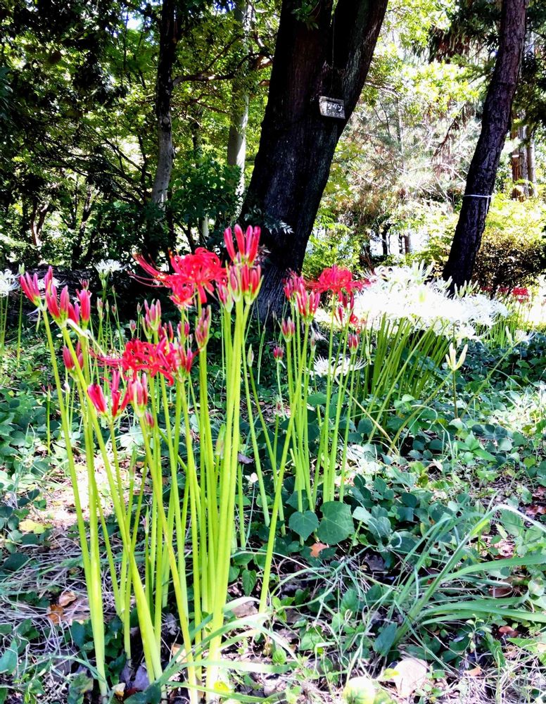 赤いヒガンバナは二割ぐらいシロバナマンジュシャゲはほぼ満開です。