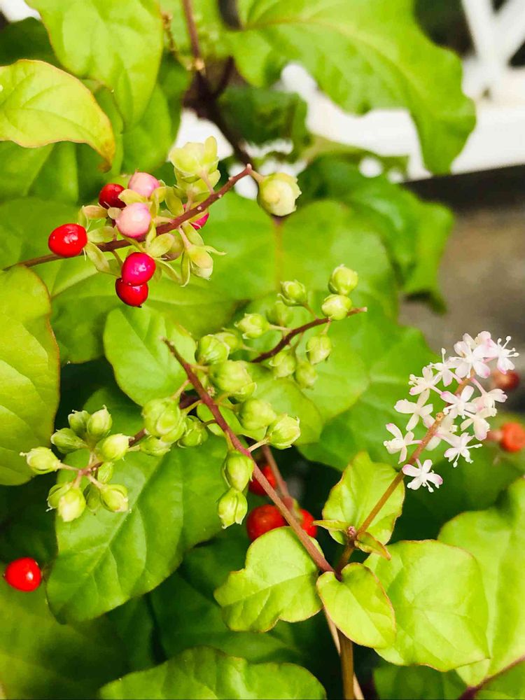 おはようございます。白い小花と赤い実の数珠珊瑚。