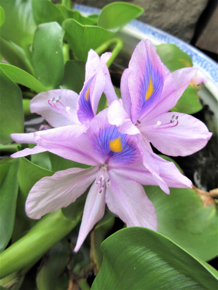 種苗店の店先で火鉢の中のホテイアオイ美しく咲いていました。