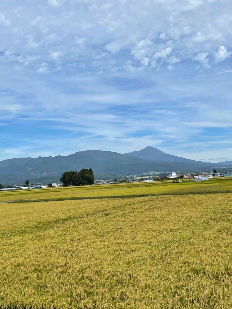広ーい田んぼの向こうに見えるのは磐梯山ですか⛰素晴らしい秋の実りの風景です🌾ここでできたお米が美味しいお酒の元にもなるんですね。