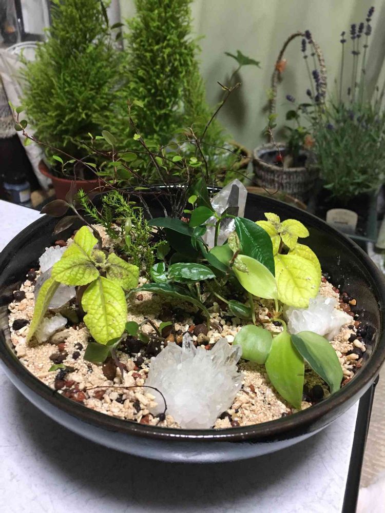 水晶のクラスターも添えてちょっとしたミニガーデン風です。