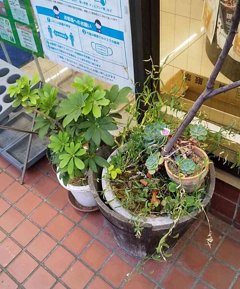 入り口に小さなプランターの寄せ植え見たことあります(^^)ファミリーマートでした。他でイートインスペースのニセ多肉に騙された事も(。-∀-)💦ありました。