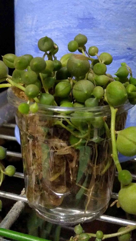 カリカリになってしまったグリーンネックレス又はピーチネックレス…養生させ、元気になったらつるしてもこもこにしたいな~とプラカップに水苔にて保湿。