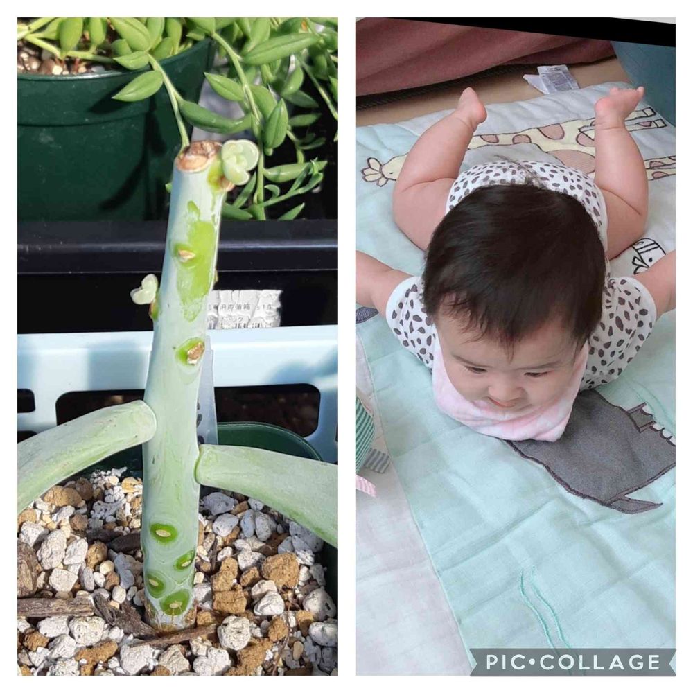 ⬅️徒長のパキフィツムの胴切り(長く茎を残すとどうなるか)した後 ベビーが出てきました😃🍀