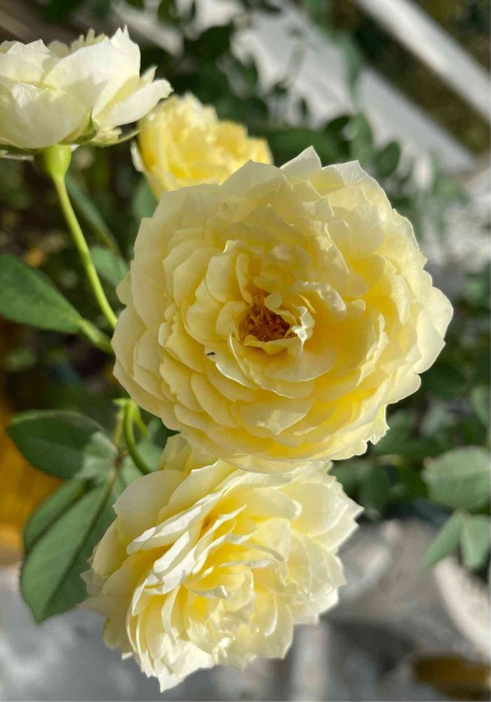 爽やかな黄色の、ふんわり可愛いカップ咲きの花が、ブーケのような房になり、繰り返し咲きます。花枝にはトゲが少なくまっすぐ伸びるので、切花としても楽しめます。枝はコンパクトで、花つきも良く