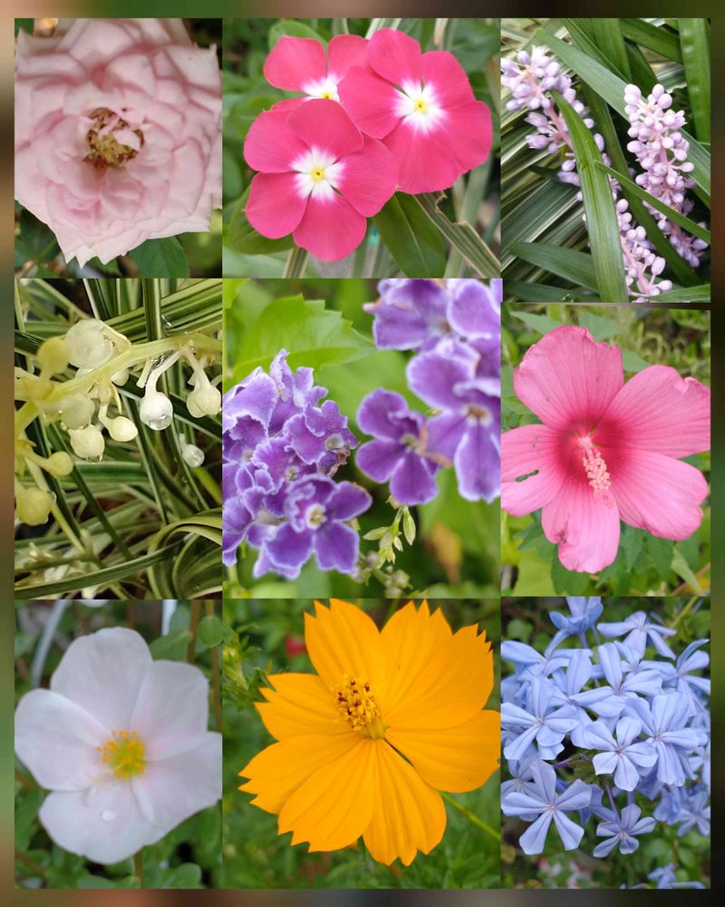 右より ヤブラン タイタンビカス ルリマツリ ニチニチソウ デュランタ・タカラヅカ キバナコスモス ミニバラ ノシラン ポーチュラカ