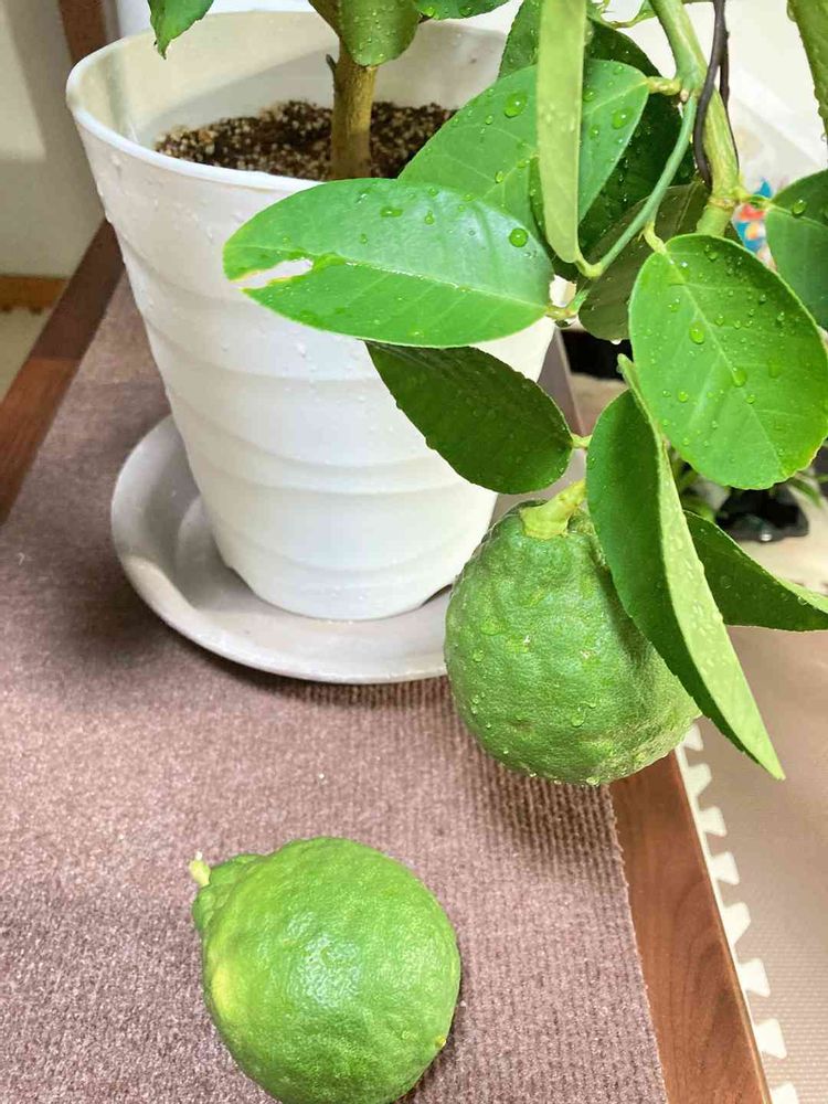 鳥のフンみたいな柄の芋虫で、調べたらアゲハ蝶の幼虫でした🦋。蝶は好きだけど、レモンのために追放しました😅