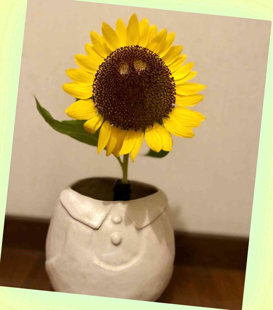可愛い花器にひまわりちゃん🌻、ほんとお目め👀みたいね。