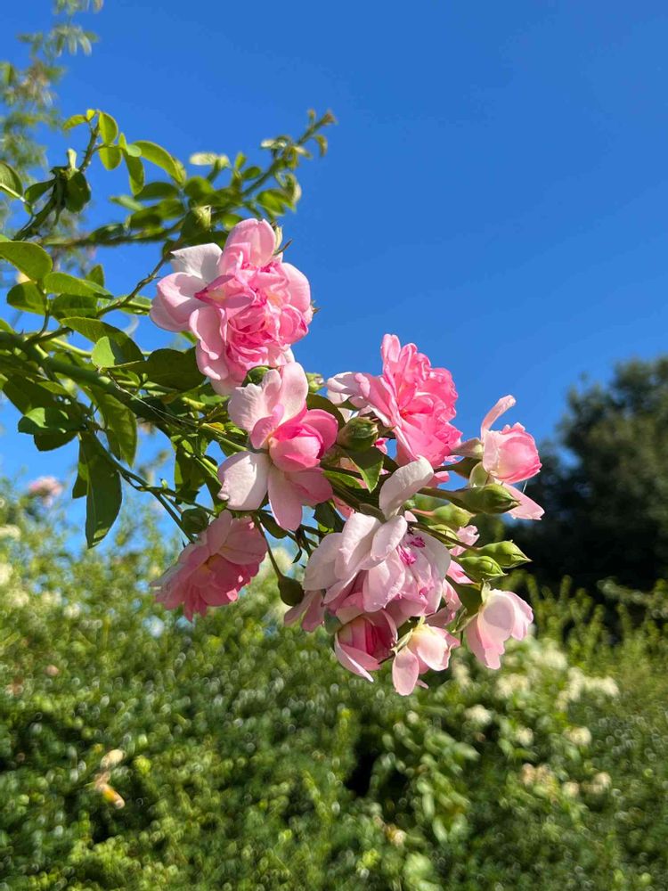 抜けるような青空💙に、ピンクのバラ💗が胸を張って咲いていますね💕