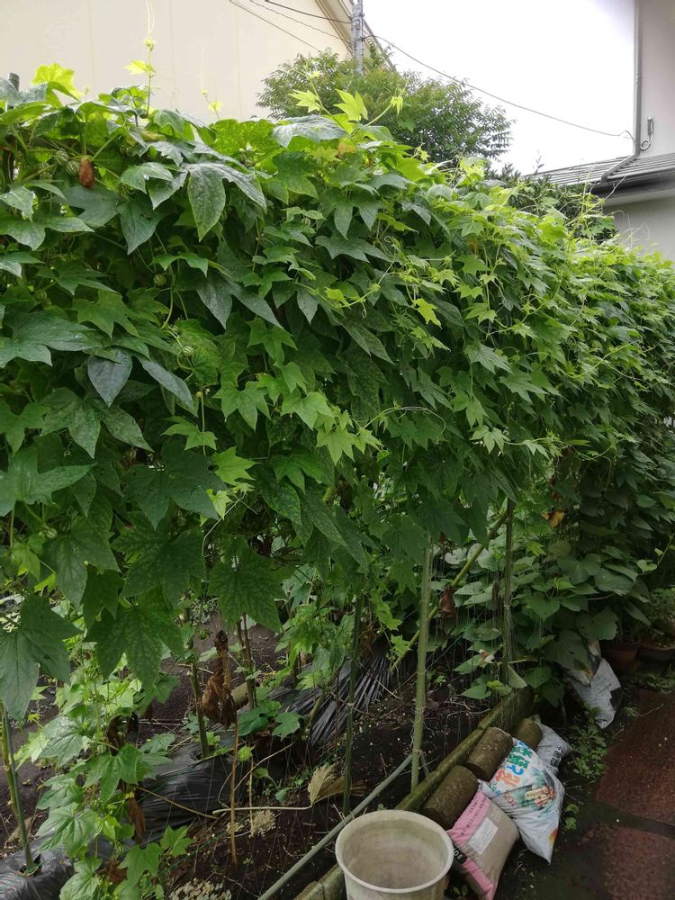 オキナワスズメウリの棚 透かしてないので 台風来たらヤバイかも 補強はしたけど