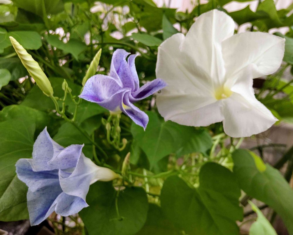 車庫へ避難中の朝顔🤍💙🌱🚿