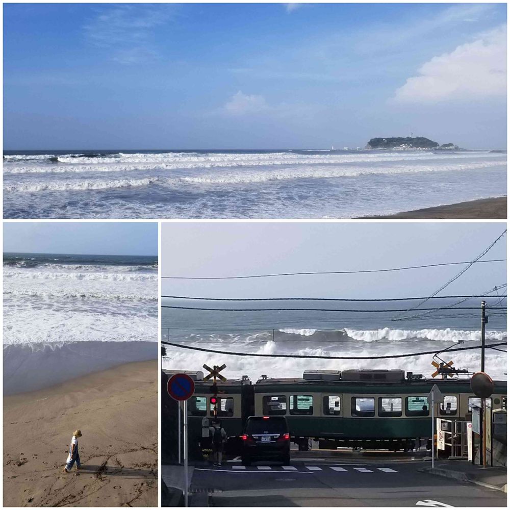 荒波で打ち寄せるワカメでも拾ってるのかな?と三陸海岸のような発想で眺めてると、七里ヶ浜を向こうの方からずっとゴミ拾いしてやって来たのは、麦わら帽子がよく似合う小麦色の女神でした👏(左下)