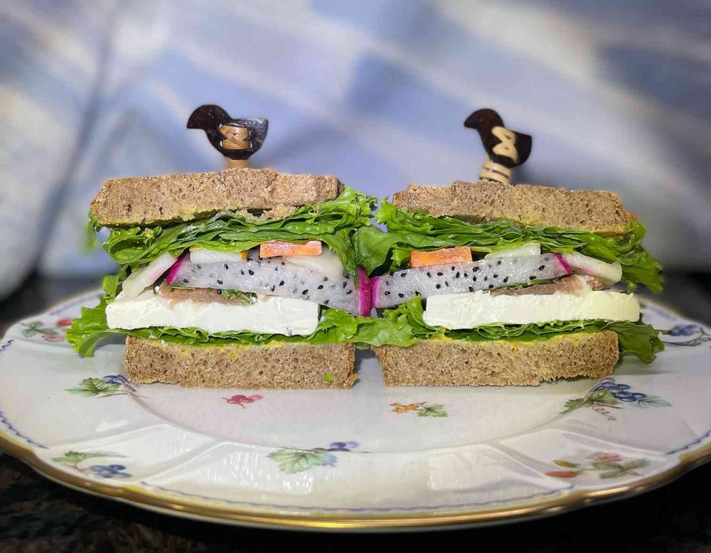 生ハムクリームチーズとドラゴンフルーツのサンドイッチ断面。