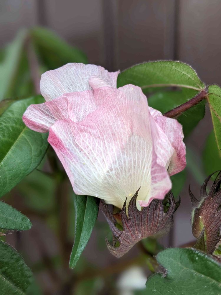 ミニコットン、綿の花がクリーム色からローズ色に変化中やわ〜凄い凄い👏🥰🎶