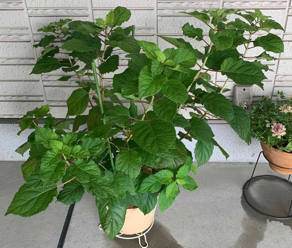 おはようございます。花がありませんが台風で避難したピンクアナベルです。そろそろ8号鉢が限界です。