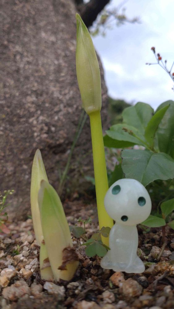 彼岸花の芽と一緒にいるのは木霊ちゃんです😯