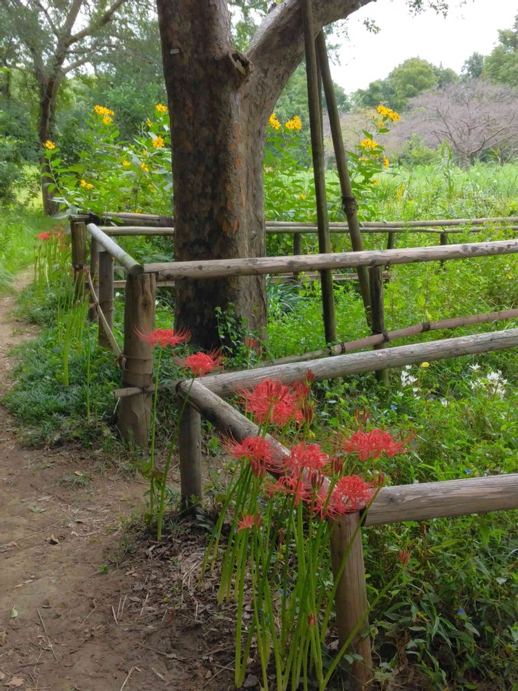 都会でも公園に行くと田舎の風情見られますね、彼岸花咲くといよいよ秋真っ盛り
