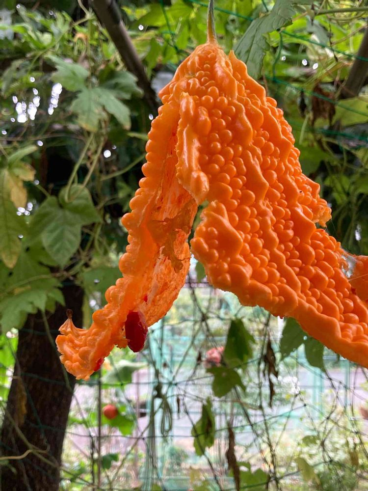 ちょっと見ないうちに、緑のゴーヤが熟れすぎて、パカッと・・