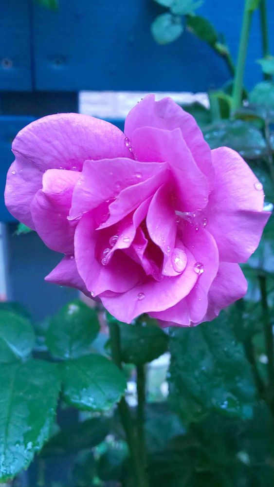 くすんだ青紫色の花がDIYしたブルーのフェンスを背に~🌹