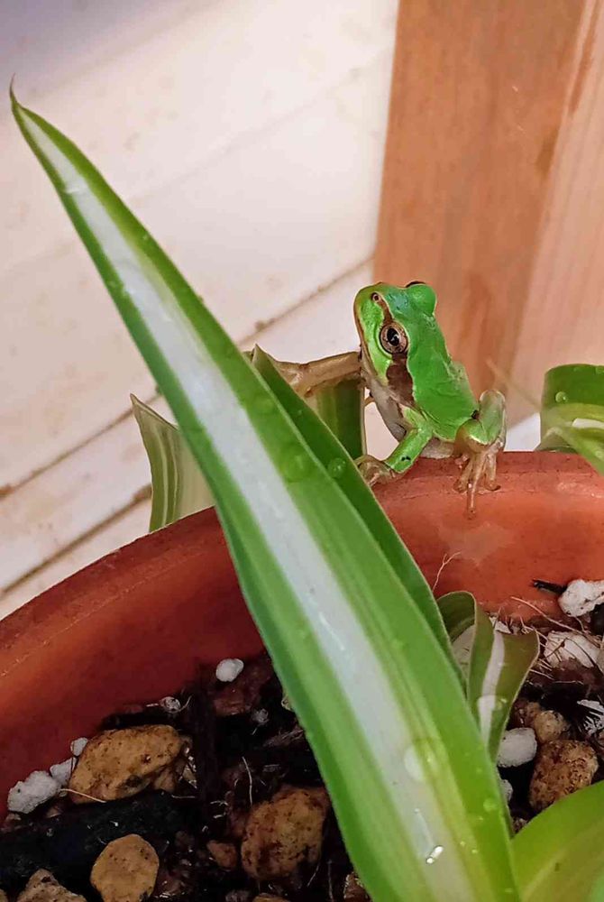 その後ベランダにオリヅルランタワーを戻してみた。そしたらビョンビョン飛んで植木鉢にピタッ😍上を眺めるんですよ🙌😂😂もう、ビックリ🤣🤣🤣その後もう一匹も戻ってきてオリヅルランタワーは賑やかになっておりました😁😁😁