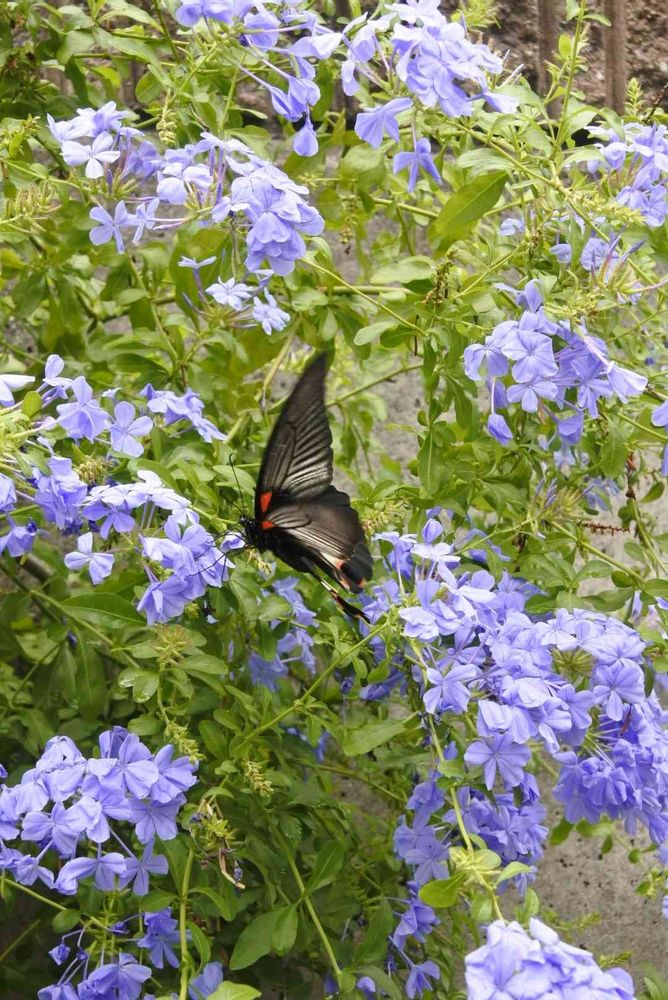 台風一過。ルリマツリにクロアゲハがやって来ました。強風に煽られながら、熱心に蜜を吸っていました。
