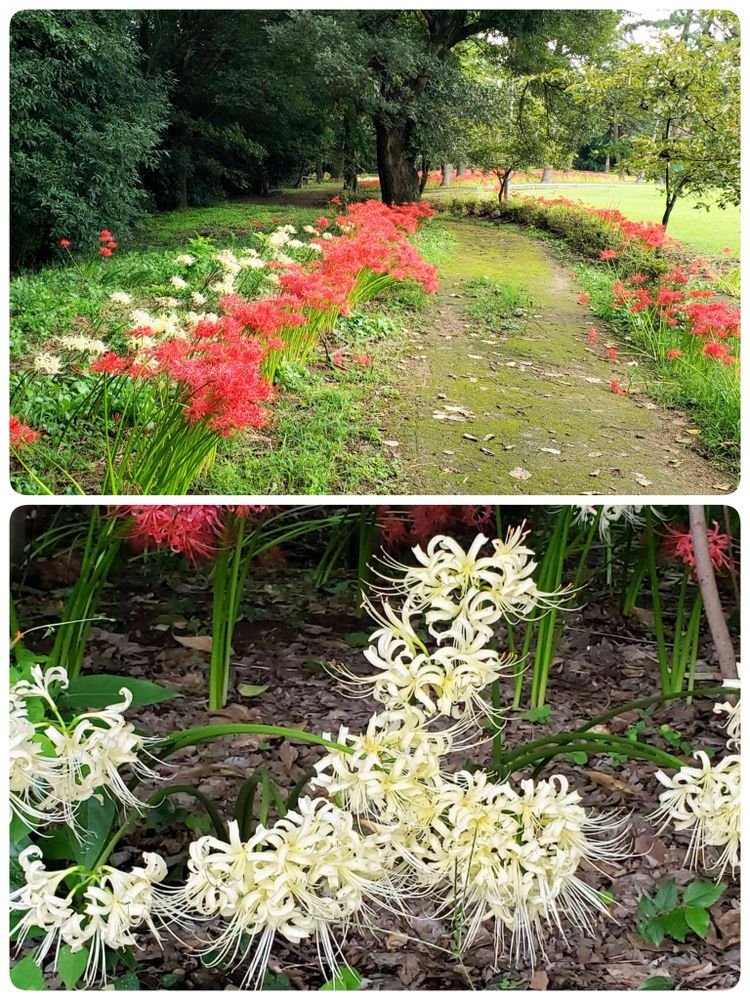 近くの運動公園の紅白のヒガンバナも見頃です。😄🎶
