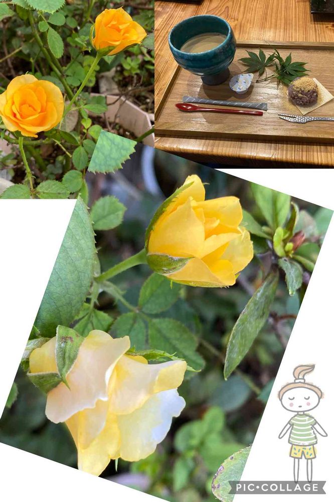 ☘️ミニばら[マンダリーナ・コルダーナ]☘️.....開花時の黄色が薄まってきて、今はもっと優しい雰囲気になりました😍✨✨ランチ屋さんの和食の後出てきた[おはぎ]とコーヒー。さりげなく秋のもみじを添えて🍁きな粉まじりの上品な味わいでした✨💕😋💕👌✨