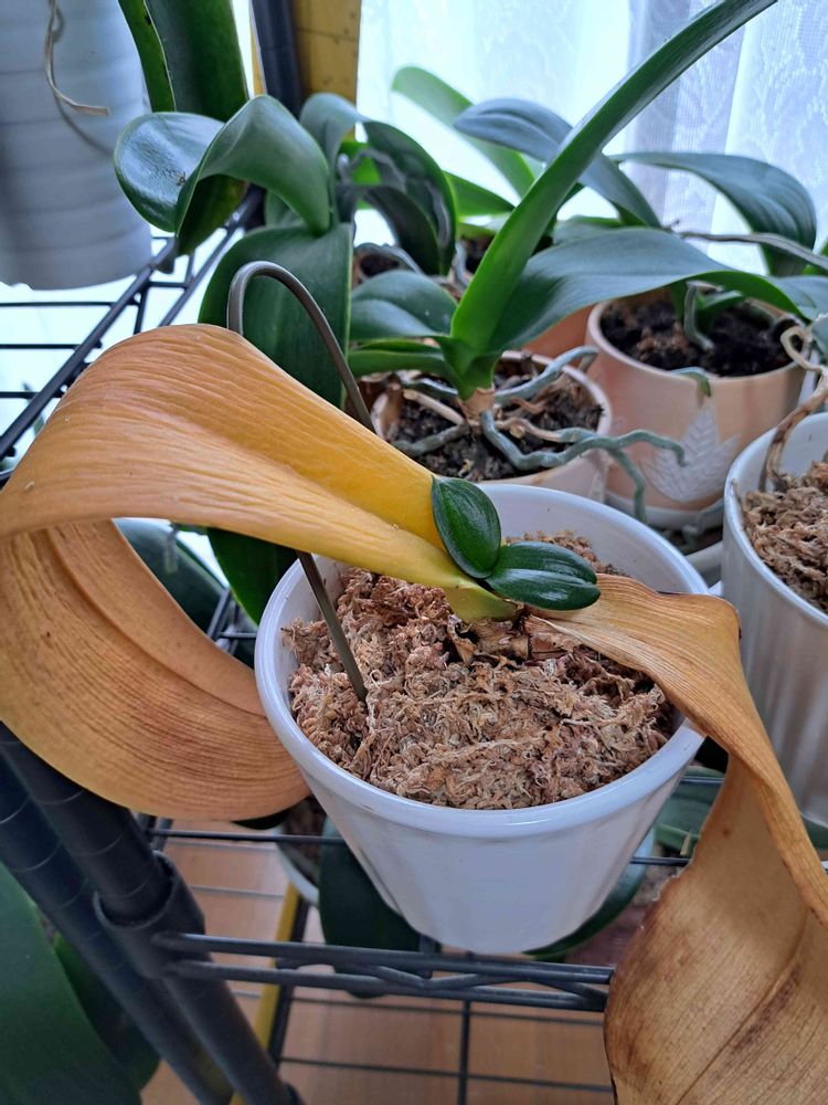 我が家も瀕死の状態の胡蝶蘭にちょっぴり緑の葉らしき見えてますが、、、